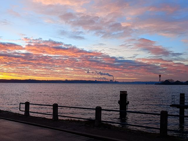 Abb.: Am Morgen des 4. Februar 2019. Am gegenüberliegenden Ufer der Förde das Heizkraftwerk Ost, rechts daneben auf der Schleuseninsel das erneuerte Leuchtfeuer Süd.