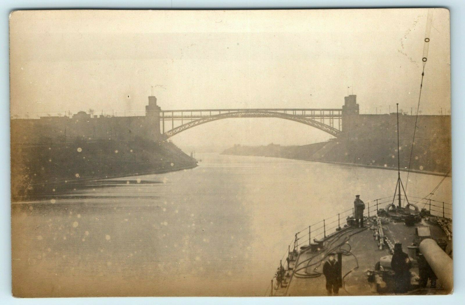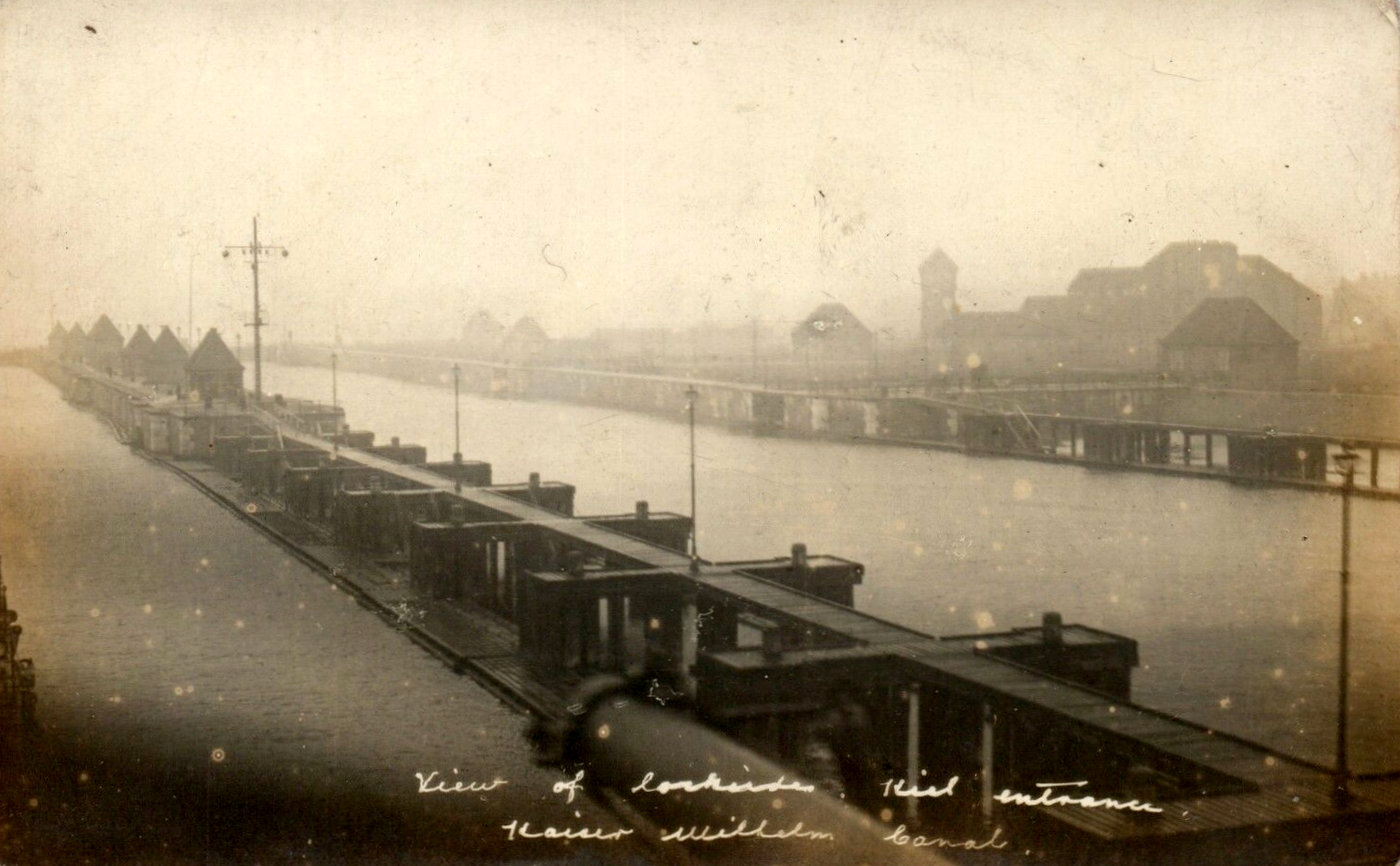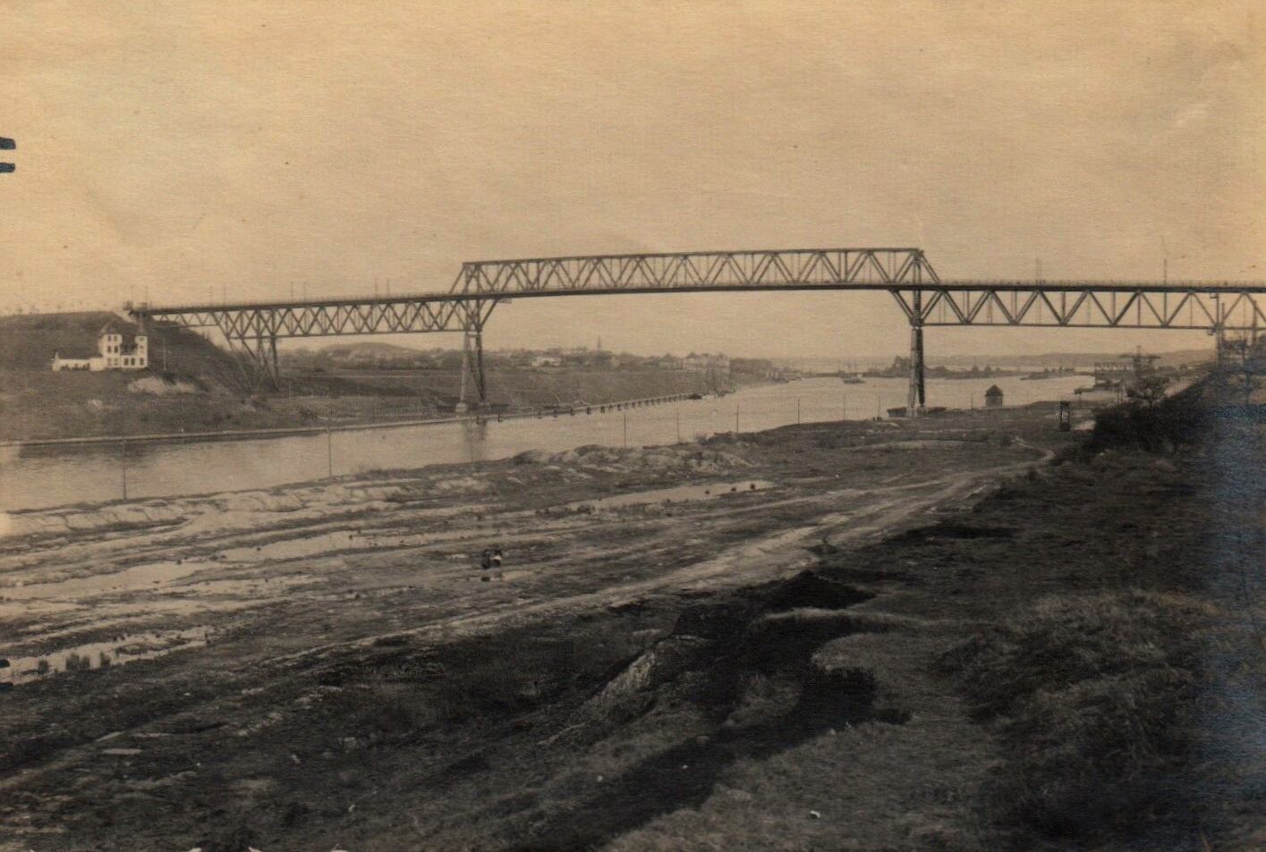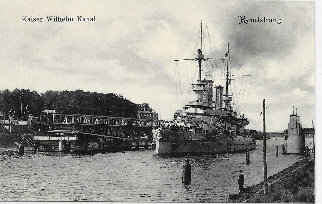 Abb.: Der Kaiser-Wilhelm-Kanal an der geöffneten Drehbrücke bei Rendsburg vor der Kanalerweiterung. Dieses Bild gibt einen Eindruck davon, wie eng — und damit auch gegenüber Angriffen gefährdet — der Kanal anfangs an einigen Stellen war.