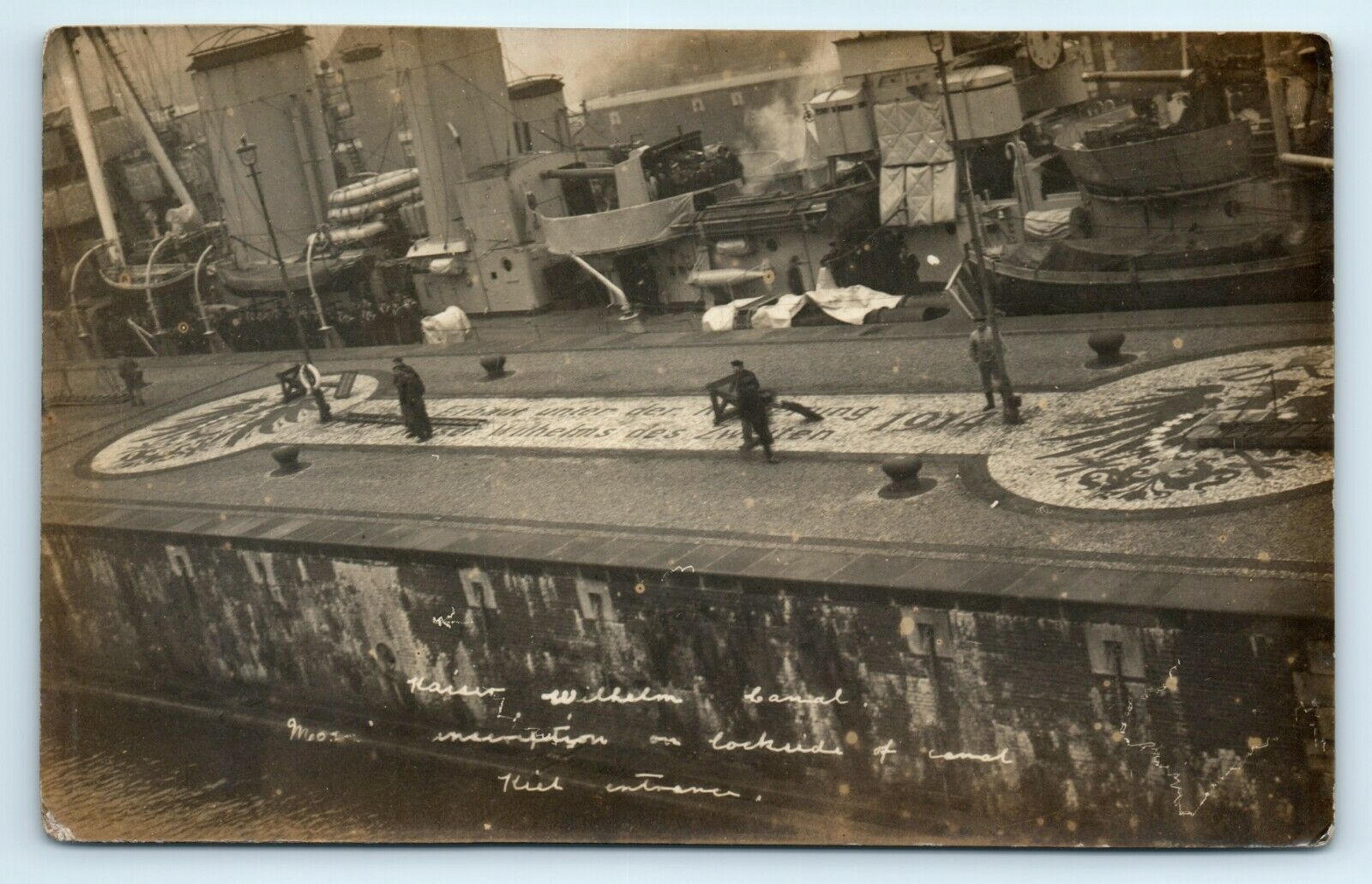Abb.: Die Mittelmauer der Neuen Schleusen mit den Reichsadlern und der Widmung für Kaiser Wilhelm II. kurz nach Ende des Ersten Weltkriegs.