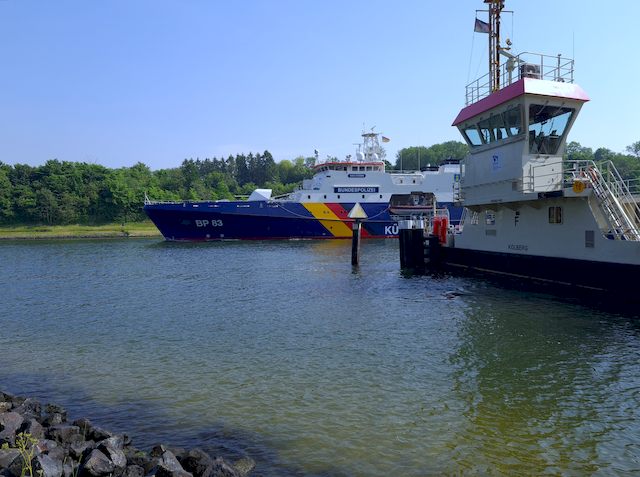 Die Kanalfähre bei Landwehr und ein Schiff der Küstenwache (© Bert Morio 2021).